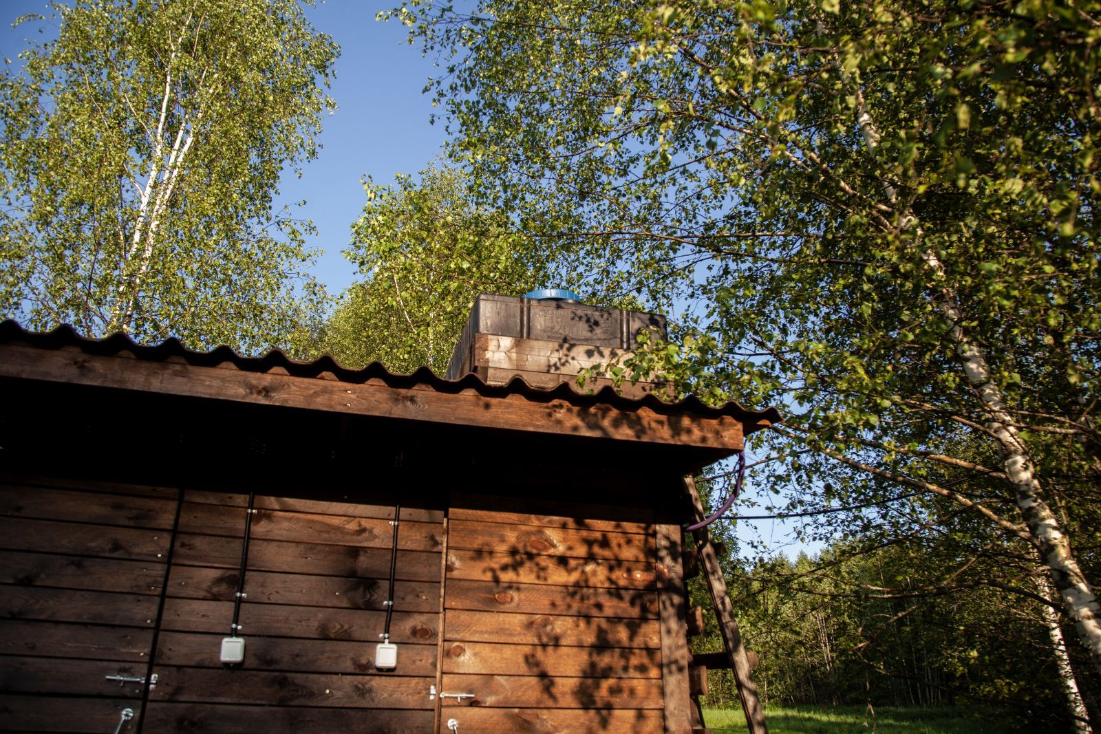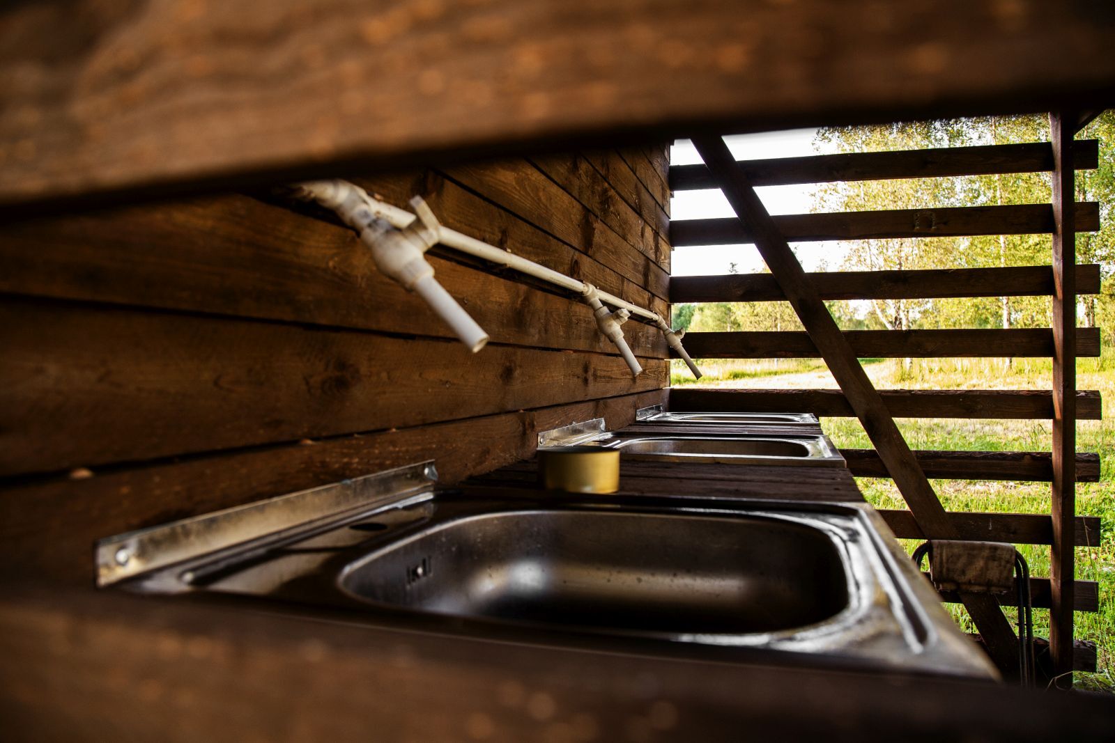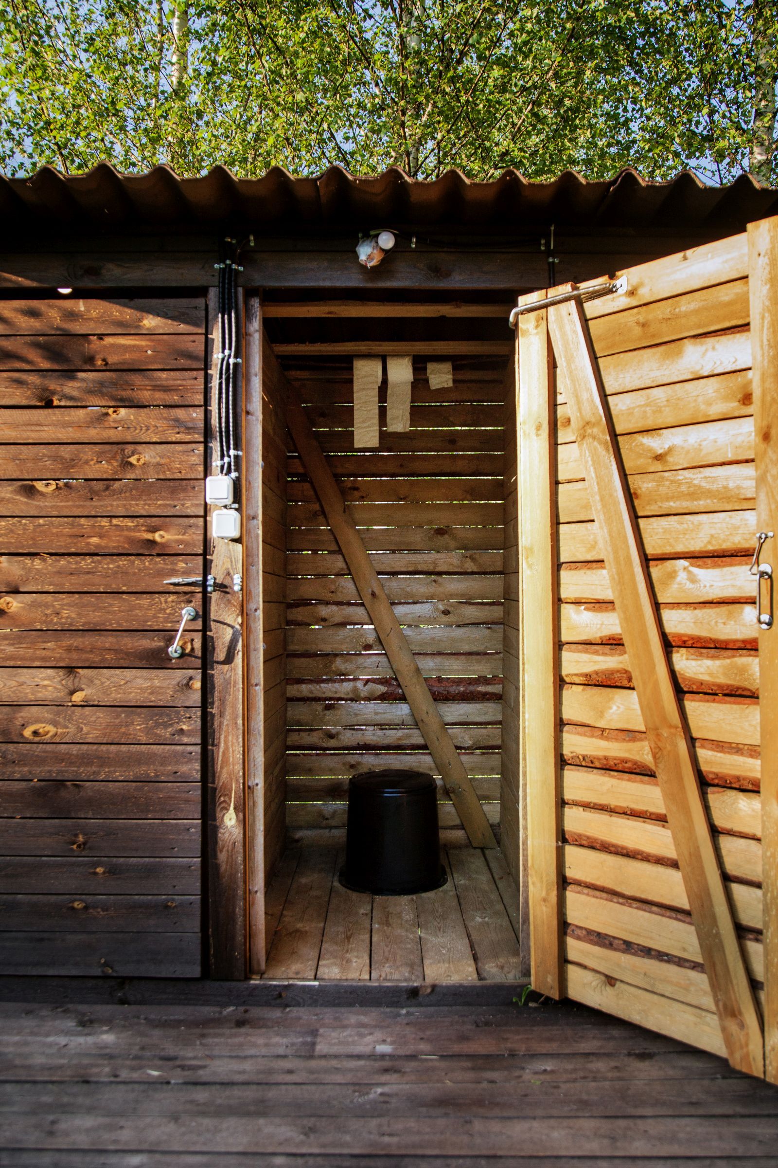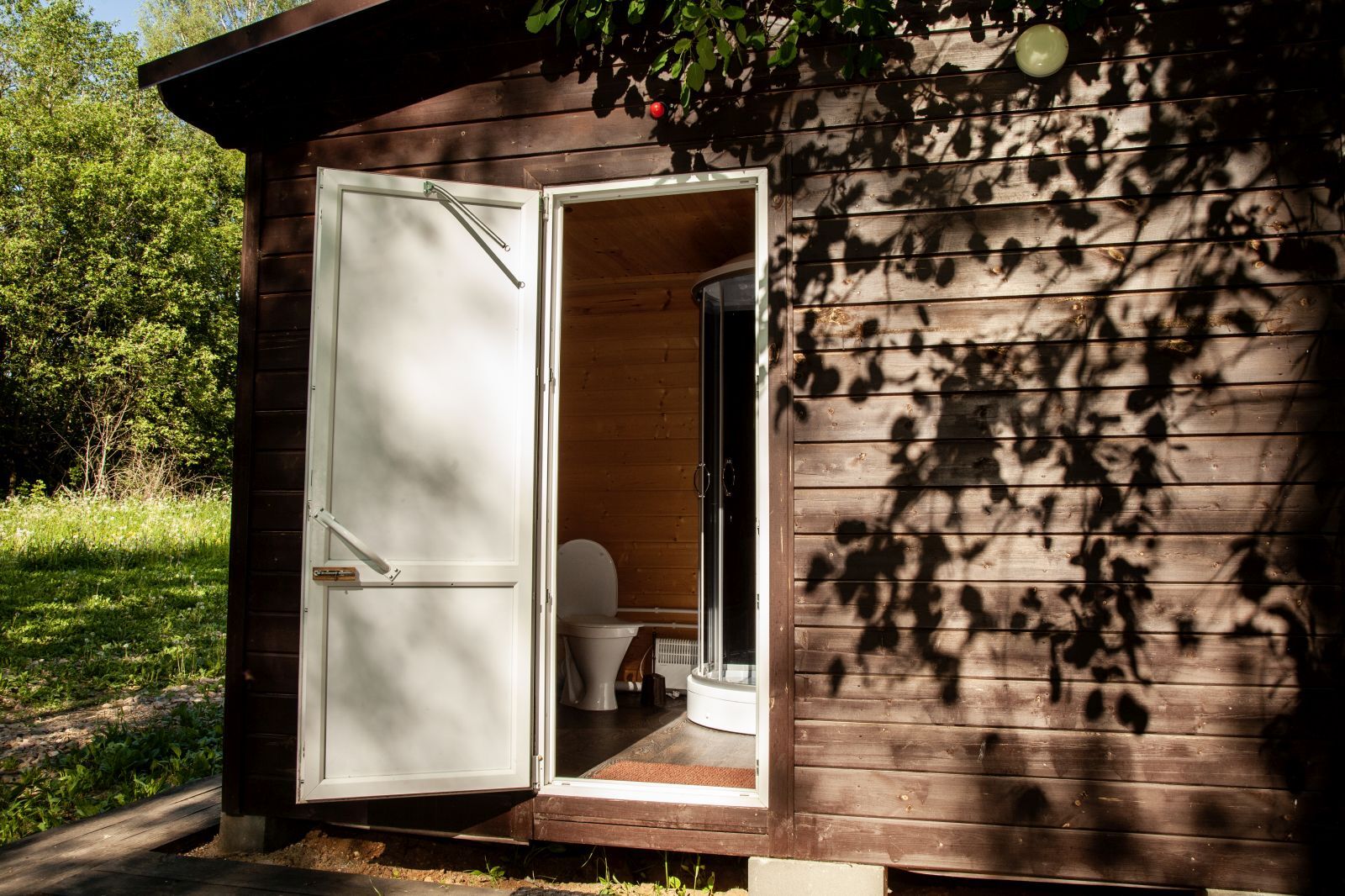 Индивидуальный санузел расположен рядом с домиком. К нему ведёт деревянный настил. Сан.узел оборудован душевой кабиной, раковиной и туалетом.