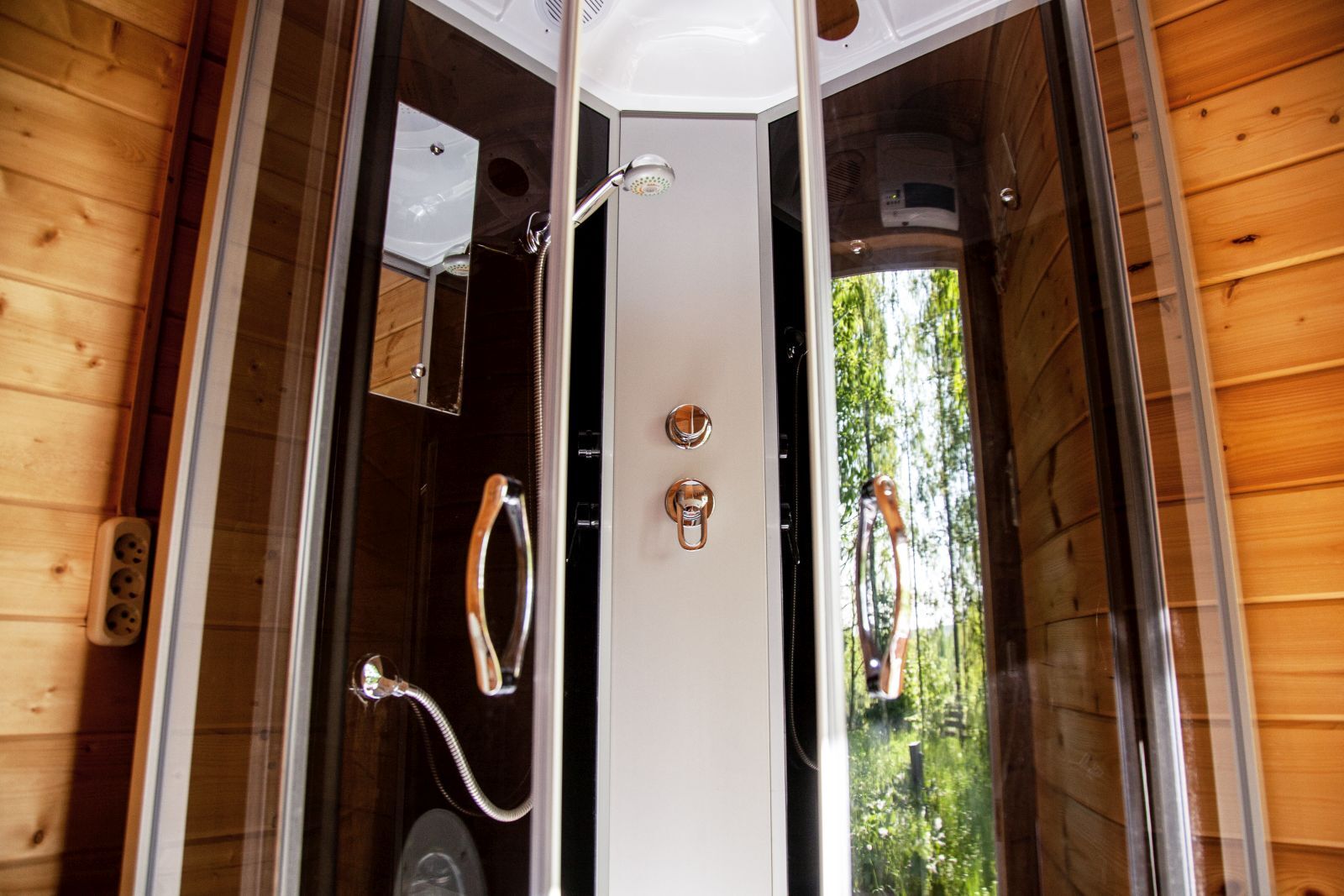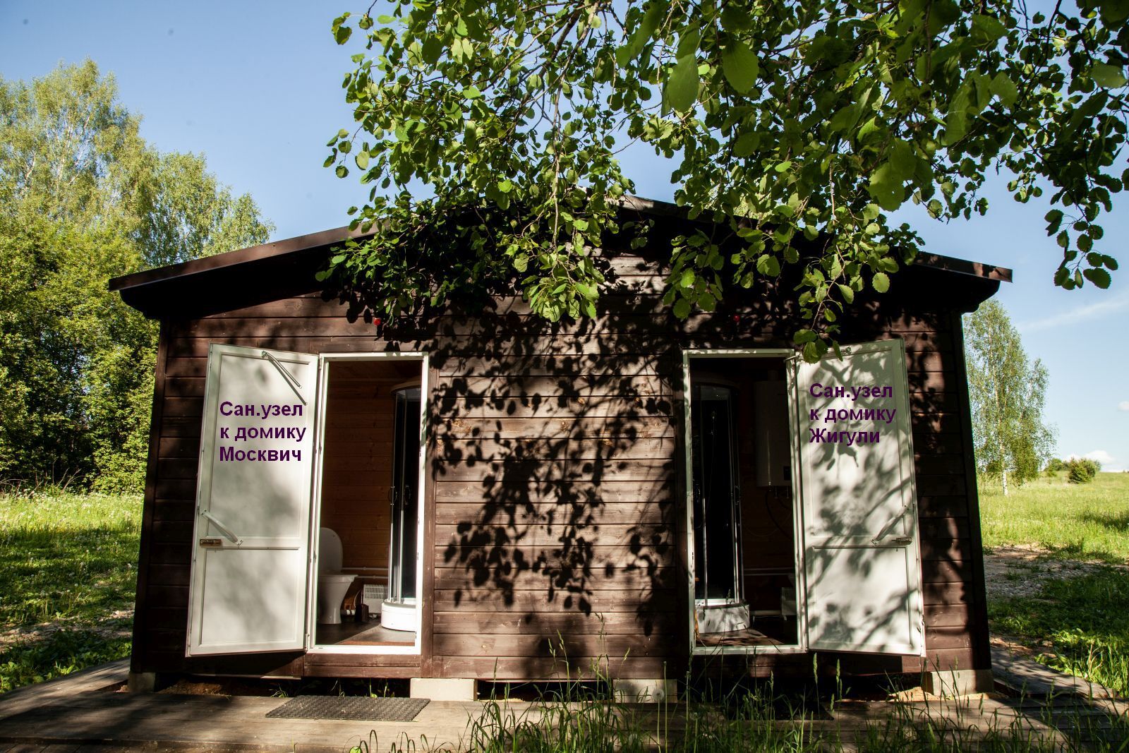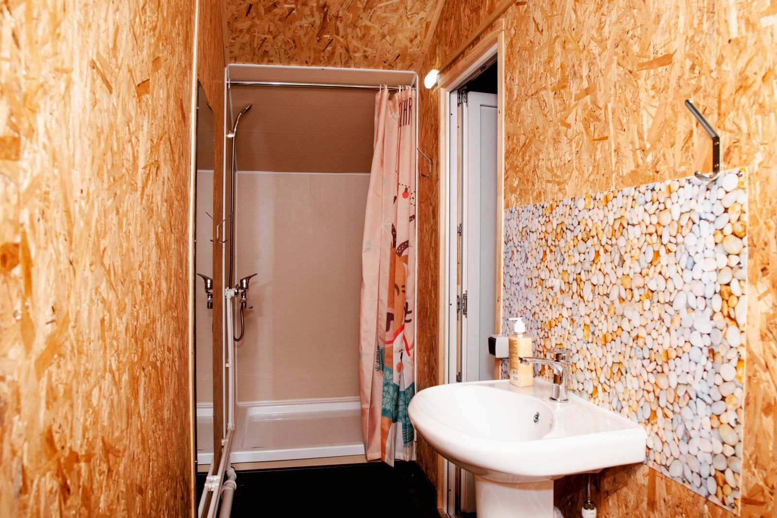 Индивидуальный санузел расположен внутри домика и оборудованы душевой кабиной, раковиной и туалетом.